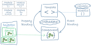 Next, we will analyze the above eight parts separately: The module consists of a piece of code that can be used to perform a simple task. The Angular application is modular and has its own module system: Each Angular should have at least one module (root module), which can generally be named: The Angular module is a module with Several important attributes are as follows: The simplest root module: Next we start the application by booting the root module, and the development process is usually in the A component is a control class of a template that handles the view portion of the application and logical pages. Component is the foundation and core of Angular application, which can be used in the whole application. The component knows how to render itself and configure dependency injection. Components interact with the view through a number of API consisting of properties and methods. There are three steps to create an Angular component: From Create a normal class and use the In The default language for Angular templates is HTML. We can tell Angular how to display the component by using a template to define the view of the component. Here is a simple example: In Angular, double curly braces are used as the interpolation syntax by default, and the value in the middle of the braces is usually the variable name of a component property. The metadata tells Angular how to handle a class. Consider the following situation where we have a component called You can attach metadata to this class and tell Angular Component that it is a component. In TypeScript, we use decorator to attach metadata. The Data binding provides an application with a simple and consistent way to display data and data interaction, which is a mechanism for managing values in the application. Through this mechanism, values can be taken and assigned from HTML, making it easier and faster to read and write data and to persist data. As shown in the figure, there are four forms of data binding syntax. Each form has a direction-from DOM to DOM, in both directions, as indicated by the arrow in the figure. Interpolation: displays component values in the HTML tag. Attribute binding: sets the property of the element to the value of the property in the component. Event binding: triggered when the component method name is clicked. Two-way binding: usin The Angular template is dynamic. When Angular renders them, it modifies the DOM according to the instructions. An instruction is a class with instruction metadata. In TypeScript, you want to pass the The following three types of instructions are included in Angular: Attribute instruction: an instruction used in the form of an attribute of an element. Structure instruction: used to change the structure of the DOM tree Component: as an important subclass of an instruction, a component can essentially be seen as an instruction with a template. A service in Angular2 is an independent module that encapsulates a specific function and can be injected into it for others to use. There are many kinds of services, including values, functions, and features required by the application. For example, when duplicate code occurs in multiple components, the duplicate code is extracted into the service for code reuse. Here are several common services: Log service Data service Message bus Tax calculator Application configuration The following example is a logging service that records logs to the browser’s console: Inversion of Control, abbreviated as IoC, is a design principle in object-oriented programming that can be used to reduce the coupling between computer code. One of the most common methods is called Dependency Injection (DI), and another is called dependency lookup (Dependency Lookup). Through control inversion, when an object is created, an external entity that regulates all objects in the system passes references to the objects onwhich it depends. It can also be said that dependencies are injected into the object. In the traditional development model, the caller is responsible for managingthe dependencies of all objects, and circular dependency has always been a nightmare, while in the dependency injection model, this management is handed over to the Injector, which is responsible for the replacement of dependent objects at run time, not at compile time. This kind of control reversal, the characteristic of running injection is the essence of dependency injection. When you The injector is a container that maintains service instances and holds previously created instances. If the requested service instance is not already in the container, the injector creates a service instance, adds it to the container, and returns the service to Angular. When all services are parsed and returned, Angular invokes the component’s constructor with those services as parameters. This is dependency injection. 1.4.1. Module ¶