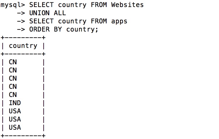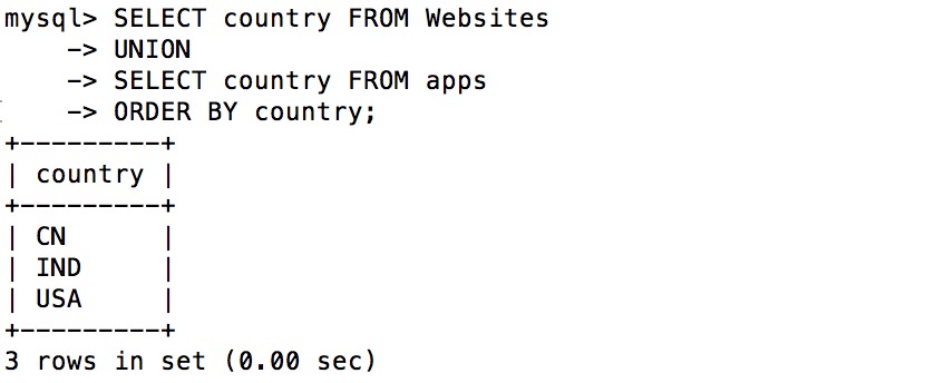 This tutorial introduces you to the syntax and examples of the MySQL UNION operator. The MySQL UNION operator is used to connect more than two MySQL UNION operator syntax format: expression1, expression2, … expression_n The column to retrieve tables: The data table to retrieve. WHERE conditions: Optional, search conditions. DISTINCT: Optionally, delete duplicate data in the result set. By default, the UNION operator has removed duplicate data, so the DISTINCT modifier has little effect on the result. ALL: Optionally, returns all result sets, including duplicate data. In this tutorial, we will use the RUNOOB sample database. Here is the data selected from the “Websites” table: Here is the data for “apps” APP: The following SQL statement selects all from the “Websites” and “apps” tables 不同的 Country (only different values): Example The output of executing the above SQL is as follows: 注释: UNION cannot be used to list all country in two tables. If some websites and APP are from the same country, each country will only be listed once. UNION only selects different values. Please use UNION ALL to select duplicate values! The following SQL statement uses UNION ALL to select from the “Websites” and “apps” tables 所有的 Country (there are also duplicate values): Example The output of executing the above SQL is as follows: The following SQL statement uses UNION ALL to select from the “Websites” and “apps” tables 所有的 China (CN) data (there are also duplicate values): Example The output of executing the above SQL is as follows:Description ¶