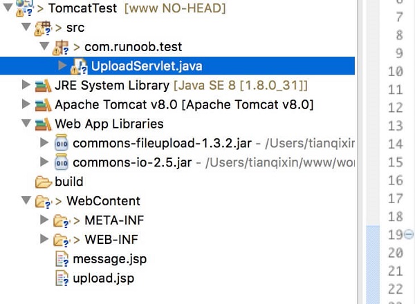 Next, we will introduce it in detail. The following HTML code creates a file upload form. The following points need to be noted: Form Form Form To upload a single file, you should use a single < input… / > tag with theattribute type= “file”. To allow multiple file uploads, include multiple name tags with different input attribute values. Enter a value for the labelwith a different name attribute. The browser associates a browse button foreach input tag. The following is the source code of UploadServlet, which is the same as dealing with file upload. Before that, let’s make sure that the dependency package has been introduced into the project’s WEB-INF/lib directory: The following example depends on FileUpload, so make sure you have the latest version of the FileUpload depends on Commons IO, so make sure you have the latest version of the You can download the two dependency packages provided by this site directly: The The Compile the Servlet UploadServlet above, and in the Now try uploading the file using the HTML form you created above. When you visit: http://localhost:8080/TomcatTest/upload.jsp in the browser, the demonstration is as follows: 2.15.1. Create a file upload form ¶