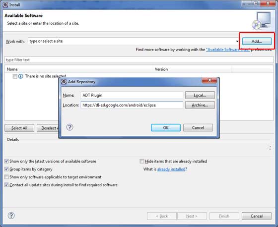 This step will help you install the Android Development tools (ADT) plug-in for Eclipse. Open Eclipse and select help > Software upgrade > install New Software. The following dialog box is displayed: