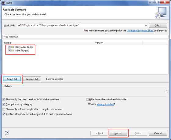 Click “Select all” to select all the listed plug-ins, and click the “next” button to guide you to install ADT tools and other required plug-ins.