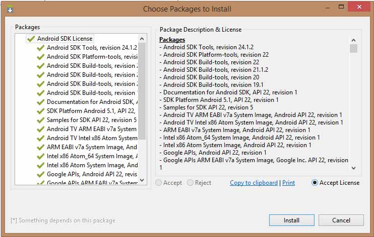 Once you open the SDK Manager, you can begin to install other required packages. By default, it lists the seven packages that need to be installed, but it is recommended that you uncheck the Android SDK documentation and the SDK sample code to reduce installation time. Next, click the install button to display the following dialog box: