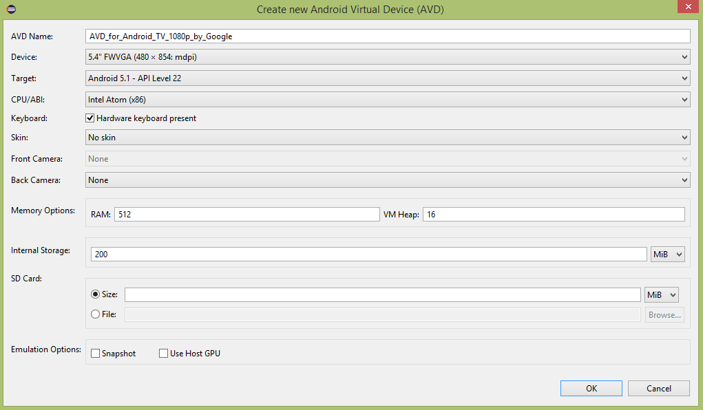 In order to test the Android application, you need a virtual Android device. So before we start writing code, create an Android virtual appliance. Start the AVD Manager from the Eclipse menu item window > Android AVD Manager. Click the “New” button to create a new Android virtual device, and enter the following information before clicking the “create AVD” button.