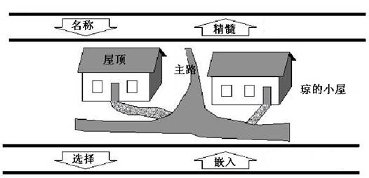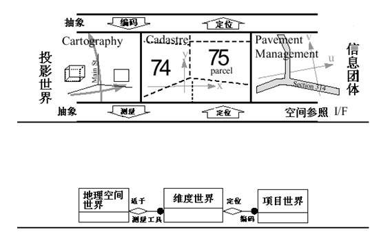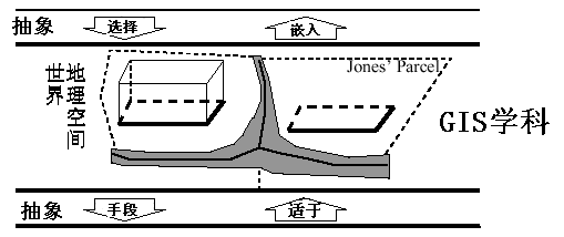 The first five models represent abstractions of the real world and are not implemented within computer software; the latter four constitute mathematical and symbolic representations of reality, destined for software implementation [ 1 ] . The real world constitutes the totality of all facts, regardless of human awareness. Through the essential nature of these facts, humans can comprehend entities in the physical realm. Fig. 19 depicts the reality in which humanity exists. Cloud-like textures dominate the illustration, representing unknown elements that contribute to the cosmos’ state of chaos. Human knowledge remains limited to familiar facts, with select examples visualized in the diagram. Fig. 19 Real world # The conceptual world represents the realm of human natural language, where humans understand and recognize named entities, thus forming a “linguistic universe.” In the conceptual world depicted in Fig. 20 , the chaotic cosmic clouds no longer exist, as such elements are typically unrepresented in natural language constructs. The schematic illustrates easily identifiable objects: doors, roads, bricks, roofs, houses, etc. Through this methodology, we can abstract the essence of facts from the real world, termed their “pith.” Since humans can assign names to known entities and perceive their fundamental nature, the interaction between the real world and the conceptual world is defined as the Epistemic Interface. Fig. 20 Conceptual world # For GIS, the conceptual world of natural language is not sufficiently abstract. Only a simplified subset of this conceptual world is of interest in GIS. This subset is termed the geospatial world, and the methodology for human interaction with the conceptual world is called selection. In Fig. 21 and the Geospatial World, there are three entity types. Each is represented by a rectangle and labeled with the name in its upper section. Fig. 21 Links between the Real World and the Geospatial World # The lines between rectangles represent relationships between entities, with each line featuring a role name at its endpoint to define the nature of the connection. The diamond symbol represents aggregation, indicating, for instance, that the existence of the conceptual world depends on the existence of the real world. The solid circle signifies the presence of a collection (rather than a single object) at that end of the relationship, indicating, for example, that each conceptual world embeds a series of distinct geospatial worlds. GIS professionals are accustomed to perceiving the world through an abstract, almost cartoon-like lens. This stems from the conceptual world’s inherent complexity, filled with intricate shapes, patterns, and details. Such complexities are eliminated in the geospatial world and replaced with simplified, explicit abstractions that are typically static in both temporal and spatial dimensions. Through this geospatial abstraction, rivers are reduced to lines, terrain is simplified into contour polygons, and forests are represented as polygons. The previously described conceptual world is reinterpreted at the geospatial level in a cartoon-like manner in Fig. 22 . While Fig. 22 is rendered in a perspective view, the geospatial world is typically observed from a “planimetric” vantage point, that is, vertically from above. Note how some features have disappeared from the diagram, while others have been significantly simplified. Fig. 22 Geospatial World # For instance, certain windows, walls, and building roofs have disappeared because they fall outside the scope of interest in the GIS worldview, they have become invisible to the GIS consciousness. Of course, there is no universal definition specifying exactly which features matter to GIS professionals; sometimes even a roof might be relevant. The cartoon simply illustrates that the geospatial world constitutes a simplified subset of the conceptual world, and the language spoken in this geospatial realm is that of the GIS discipline. In the diagram, building foundations remain visible even though they were partially obscured by other elements in the conceptual world. From a GIS perspective, all foundations of a structure are considered visible—even those physically hidden. Each GIS implementation follows specific rules governing which features are recognized in the geospatial world and how they are abstracted from the conceptual world. For example, one rule might reduce a brick building to a 3D polyhedron, while a house with different surface materials could be simplified to its foundation polygon. In essence, elements invisible in the conceptual world may become visible in the geospatial world due to their specialized interest in GIS. The interaction between the conceptual and geospatial worlds is termed the GIS Discipline Interface, with the methodological approach from the conceptual side called selection. To reverse this interaction from geospatial back to conceptual, we employ the embedding method, which positions GIS-relevant content within its proper context in the conceptual world. Features recognized in the geospatial world typically possess a natural dimensionality, 0, 1, 2, or 3, depending on whether they are represented as points, lines, areas, or volumes. Additionally, they carry further measures based on binary topological relationships such as containment, adjacency, or separation. The next level of abstraction identifies these inherent dimensional and metric properties of features, hence termed the Dimensional World, where feature measurements are acquired through instrumental observations in Euclidean space. The Dimensional world is an abstraction of geospatial world, including some measuring tools, such as tape measure and compass. The facts recognized at this level include the Unary relation (such as the length of an arc) and the Binary relation (such as the distance between two points), which are themselves abstractions of various elements. The interface