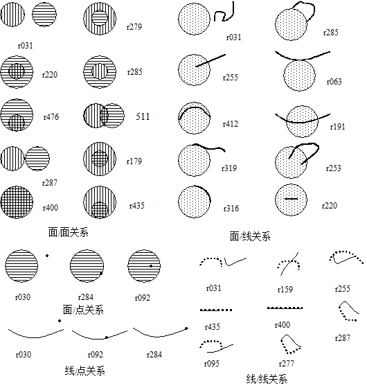 As can be seen from the table above, the number of possible topological relationships is far less than 512 (surface/surface: 6, surface/line: 19, surface/point: 3, line/line: 16, line/point: 3, point/point: 2). Figures 3-14 illustrate these possible relationships. In a sense, the topological relationship described by the 9-intersection model is only the category of the topological relationship. For each category, there are many possible situations, such as two intersecting lines, one intersection point and multiple intersections, which are consistent, but the topological relationship is different. Fig. 40 9-Intersection Model Topological Relation Diagram #