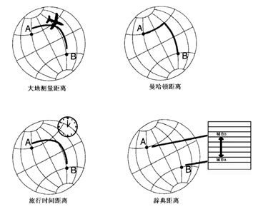 The basic spatial object metric relationships include the distance between points/points, points/lines, points/surfaces, lines/lines, lines/surfaces, and surfaces/surfaces. On the basis of the relationship between basic objectives, the metric relationship among point group, line group and surface group can be constructed. For example, on the basis of known point/line topological relationship and point/point metric relationship, the shortest path, optimal path and service range between points/points can be obtained. Known point, line and surface metric relationship can be used for distance measurement, proximity analysis, clustering analysis, buffer analysis, Tyson polygon analysis, etc. Quantitative measurement of spatial relationship between regional spatial indicators and regional geographic landscape is a unique capability of GIS. The regional spatial indicators include: Geometric indicators: location, length (distance), area, volume, shape, orientation and other indicators; Physical and geographical parameters: slope, slope direction, surface irradiance, topographic fluctuation, river network density, cutting degree, accessibility, etc; Indicators of human geography: such as concentration index, location quotient, difference index, geographic correlation coefficient, attraction range, transportation convenience, population density, etc. The distance between two points in geographic space can be measured along the actual surface of the earth or along the distance of the ellipsoid of the earth. Specifically, the distance can be expressed in the following forms (taking the distance between two cities on the earth as an example) (Fig. 3-15): Geodetic distance : The distance is the one that between two urban centers along the earth’s great circle. Manhattan Distance : Latitude difference plus longitude difference (the name “Manhattan Distance” is because the Manhattan, street patterns can be modeled as a set of two vertical lines). Travel time and distance : The shortest time from one city to another can be represented by a series of designated routes (assuming that each city has at least one airport). Dictionary Compilation Distance : The absolute difference between the locations of a series of cities in a fixed geographical list. Fig. 41 Distances of various forms on Earth # Measurement of Spatial Indicators #