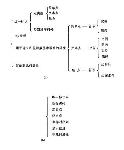 Among them, the unique identification code is the system permutation serial number. The line identification code can identify the type of line, and the starting and ending point numbers can be directly expressed in coordinates. The display information is the text or symbol when displayed, and the non-geometric attributes associated with the line can be directly stored in the line file, or can be stored separately, and searched by the identification code. Fig. 95 The encoding of point entities and the encoding of line entities #