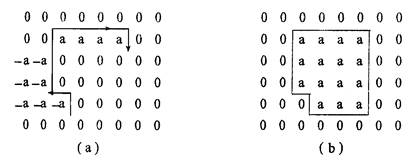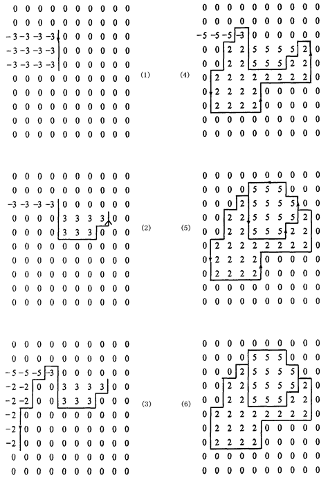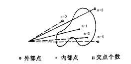 For point entities, each entity is represented by only one coordinate pair. The conversion between vector structure and grid structure is basically a coordinate accuracy conversion problem, and there is no big technical problem. The vector structure of a line entity is represented by a series of coordinate pairs. When changing into a grid structure, besides changing the coordinate pairs in the sequence into grid row coordinates, a series of grid points need to be inserted between the coordinate points according to the grid accuracy requirement, which is also easy to be obtained by the two-point linear equation. Line entity is changed from grid structure to vector structure, and polygon boundary is expressed as vector structure. Therefore, the conversion between vector structure and grid structure of polygon (surface entity) is discussed. Conversion from vector format to raster format, also known as polygon filling, is to assign polygon encoding to all raster points within the boundary of the polygon represented by vectors, thus forming a raster data array similar to Figure 7-4. Several main algorithms are described as follows: 1) Internal Point Spread Algorithms The algorithm starts with an interior point (seed point) of each polygon and diffuses to its eight-direction neighboring points to determine whether each new join point is on the polygon boundary or not. If it is on the boundary, the new join point is not regarded as seed point. Otherwise, the neighboring point of the non-boundary point is regarded as a new seed point to perform a new diffusion operation with the original seed point, and assigns the seed point to the number. Repeat the process until all seed points fill the polygon and stop at the boundary. The program design of diffusion algorithm is complex, and in a certain grid accuracy, the polygon will be disconnected if two boundaries of the same polygon of complex graphics fall in the same or adjacent two grids, such a seed point can not complete the filling of the whole polygon. 2) Complex Integral Algorithms The polygon code to which each grid cell in the entire raster array belongs is determined on a cell-by-cell basis. The judgment method involves calculating the complex integral of the closed boundary of each polygon with respect to the point to be judged. For a given polygon, if the integral value equals 2πr, the point belongs to this polygon and is assigned the corresponding polygon identifier; otherwise, it lies outside the polygon and does not belong to it. 3) Ray algorithm and scanning algorithm The ray algorithm can judge by point the data grid point whether is outside a polygon or within a polygon. Cite a ray from the inside point to outside point of a graph, and judge the total number of times that whether the ray intersects with all boundaries of a polygon. If the number of times that the ray intersects is even, the point to be judged is outside the polygon, if it is odd, the point to be judged is inside the polygon (Fig. 7-12). When using ray algorithm, it should be noted that there are some special cases that may affect the number of intersections when the ray intersects the polygon boundary, which must be excluded (Fig. 7-13). The scanning algorithm is an improvement of the ray algorithm. It changes the ray to scan the line along the grid array column or row direction. The judgment is similar to that of the ray algorithm. Scanning algorithm eliminates a lot of calculation of intersection point between ray and polygon boundary, and greatly improves the efficiency. Fig. 99 Ray algorithm # Fig. 100 Special case of ray algorithm # 4)BAF(Boundary Algebra Filling) Filling Algorithm[**Ren Fu Hu ]** The BAF Filling Algorithm is a vector format to raster format conversion algorithm based on integral idea. It is suitable for converting polygon vector data recording topological relations into raster structure. Figure 7-15 shows the conversion of a single polygon. The polygon number is ‘a’, which imitates the process of calculating the area of the polygon area by integral. The initial grid array has zero grid values. The grid rows are taken as the reference coordinate axis. The boundary line is searched clockwise from a point on the polygon boundary. When the boundary is upward (Figure 7-15-a), all the same coordinates are located on the left side of the boundary. The grid is subtracted ‘a’. When the boundary goes down (Figure 7-15-b), all grid points on the left side of the boundary (the forward direction is seen as the right side) are added a value ‘a’, and the polygon transformation is completed when the boundary search is completed. Fig. 101 Conversion of a single polygon # Fig. 102 Conversion of multiple polygons # In fact, each digital map is composed of multiple polygonal regions. If the region that does not belong to any polygon (including the region with infinite points) is regarded as a special polygon region numbered zero, then each boundary arc on the map is adjacent to two polygons with different numbers. According to the forward direction of the arc, they are called left and right polygons respectively. It can be proved that for the problem of vector-to-grid conversion of polygons requires only the following operations for all polygonal boundary arcs, regardless of the order of arrangement. When the boundary arc is up, the grid between the arc and the left frame increases by one value (left polygon number minus right polygon number). When the boundary arc is down, the grid between the arc and the left frame increases by one value (right polygon number minus left polygon number). The transformation process of the two polygons is shown in Figure 7-16. The difference between the boundary algebraic method and other algorithms is that it does not complete the transformation of the relationship between boundary and point by point, but dynamically assigns boundary location information to each grid point by simple addition and subtraction algebraic