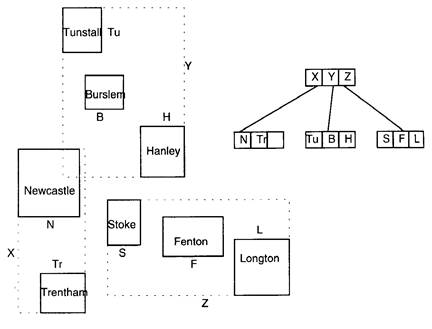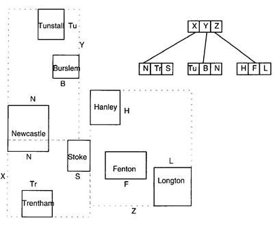 Because of the overlap of spatial regions corresponding to R-tree brothers’nodes, R-tree can easily insert and delete. However, because of the overlap between regions, spatial indexing may need to search multiple paths to get the final results, so its spatial search efficiency is low. It is this reason that leads to the emergence of R + tree (Figure 7-21). In R + tree, there is no overlap of spatial regions corresponding to sibling nodes, and the speed of spatial index searching can be greatly improved by the division of regions without overlap. However, the efficiency of insertion and deletion operations is reduced because of the need to ensure that the corresponding spatial regions of sibling nodes do not overlap when inserting and deleting spatial objects. Fig. 107 R+ Tree #