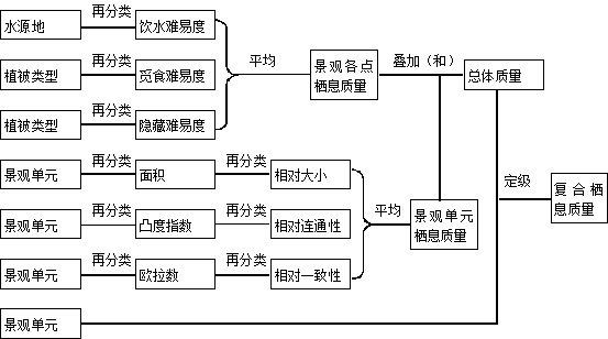 This example is a simplified model for the evaluation of the habitat of herbivores, the model only considers the basic factors that influence the survival of herbivores: water, food, and hidden conditions, as well as metrics for the area, connectivity, and fragmentation of landscape units, the model form is shown in Figure 10-2: Fig. 149 A model for evaluating the habitat quality of herbivores #