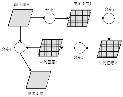 There are also some GIS software that provide advanced visual map modeling aids, users only need to use the tools provided to draw the flow chart of the model in the window, specify the meaning of the flow chart, the parameters used, matrix, etc. The design of the map model without the need to write complex command programs. Visual map modeling tools provide users with a high level of design tools and tools that allow users to focus more on professional research (Figure 10-4). Fig. 151 A GIS model represented by a flow chart #