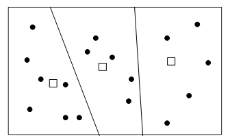 Through the distribution between the demand point and the supply point, the subsidiary area of the supply point is also determined, as shown in Figure 10-17. Fig. 164 The locations of public facilities and their associated areas (in the diagram, solid circles represent demand points, squares represent supply points, and the boundaries of the service areas of the supply points are simplified as straight lines, which is not the case in reality). #