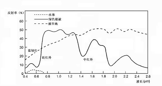 The basis of remote sensing technology is to interpret and analyze the targets and phenomena of the earth’s surface by observing electromagnetic waves. It utilizes the electromagnetic wave characteristics of the earth’s objects, that is, “all objects have the characteristics of reflecting or radiating electromagnetic waves of different wavelengths because of their different types and environmental conditions” (Fig. 12-1). So remote sensing can also be said to be a method of using objects to reflect or radiate electromagnetic waves. The inherent characteristics of the object, through the observation of electromagnetic waves, identify the object and the existence of environmental conditions of the object technology. Fig. 188 Electromagnetic reflection curves of several common ground objects (water, green vegetation, bare dryland) #