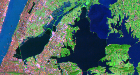 Processing of remote sensing data, usually in the form of images, mainly includes correction (including radiation correction and geometric correction), enhancement, transformation, filtering, classification and other functions. Its main purpose is to extract various thematic information, such as land construction, vegetation coverage, crop yield and water depth, etc. (Figure 12-4). Remote sensing image processing can adopt optical processing and digital processing. Digital image processing is widely used because of its good repeatability and easy integration with GIS. Following is a brief introduction to the main functions of digital image processing. Fig. 191 TM composite image near Donghu Lake, Wuhan City. Ships on the Yangtze River are clearly visible. # (Synthetic scheme: R = TM7, G = TM4, B = TM2, enhanced)