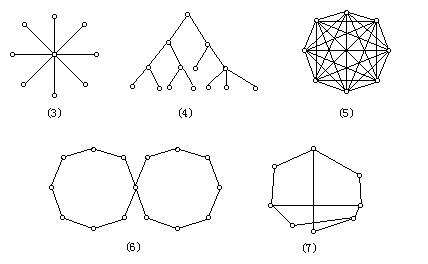 (1)总线结构,(2)环形结构,(3)星形结构,(4)树形结构, (5)完全连接,(6)相交环形,(7)不规则拓扑结构
